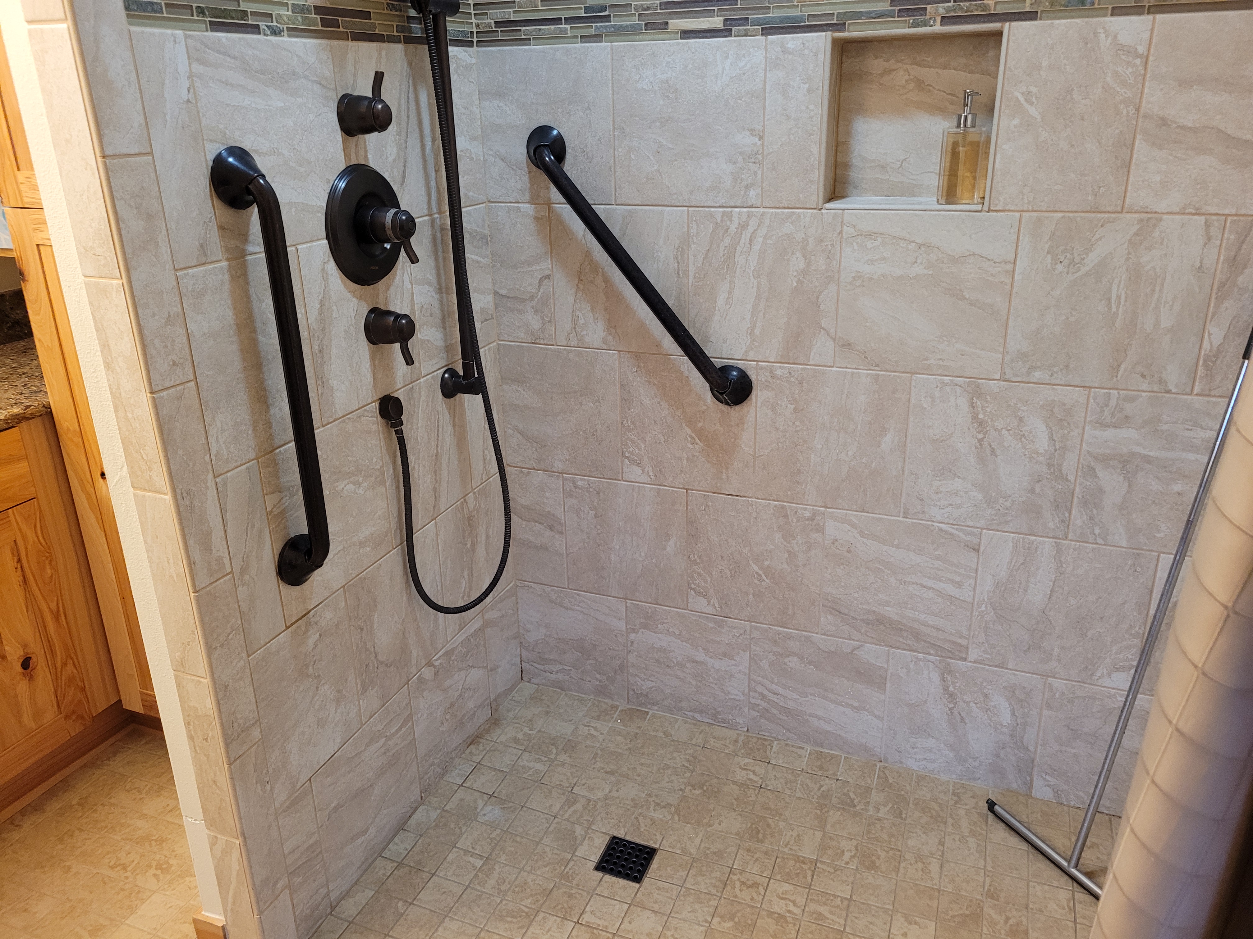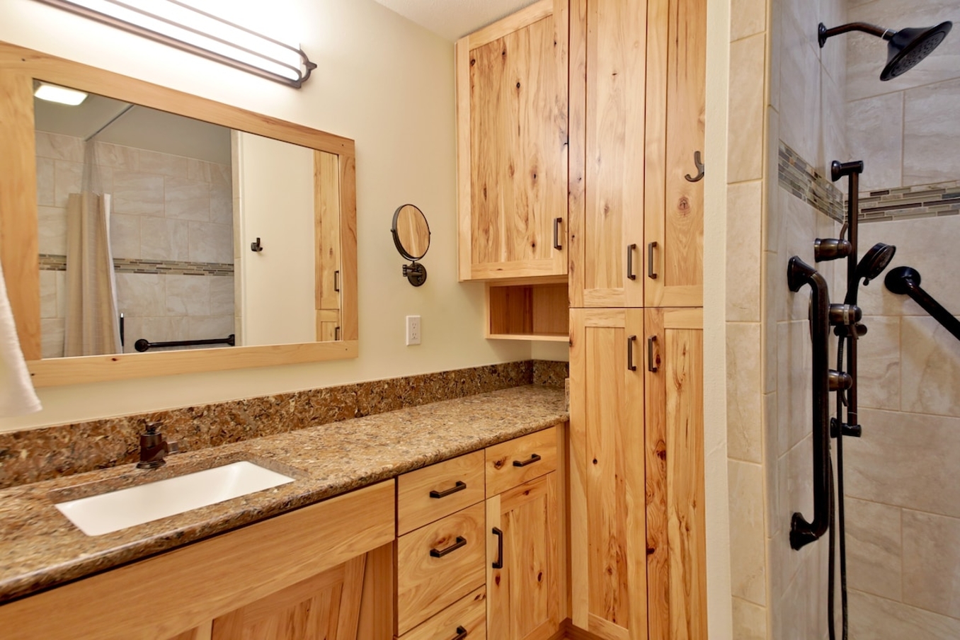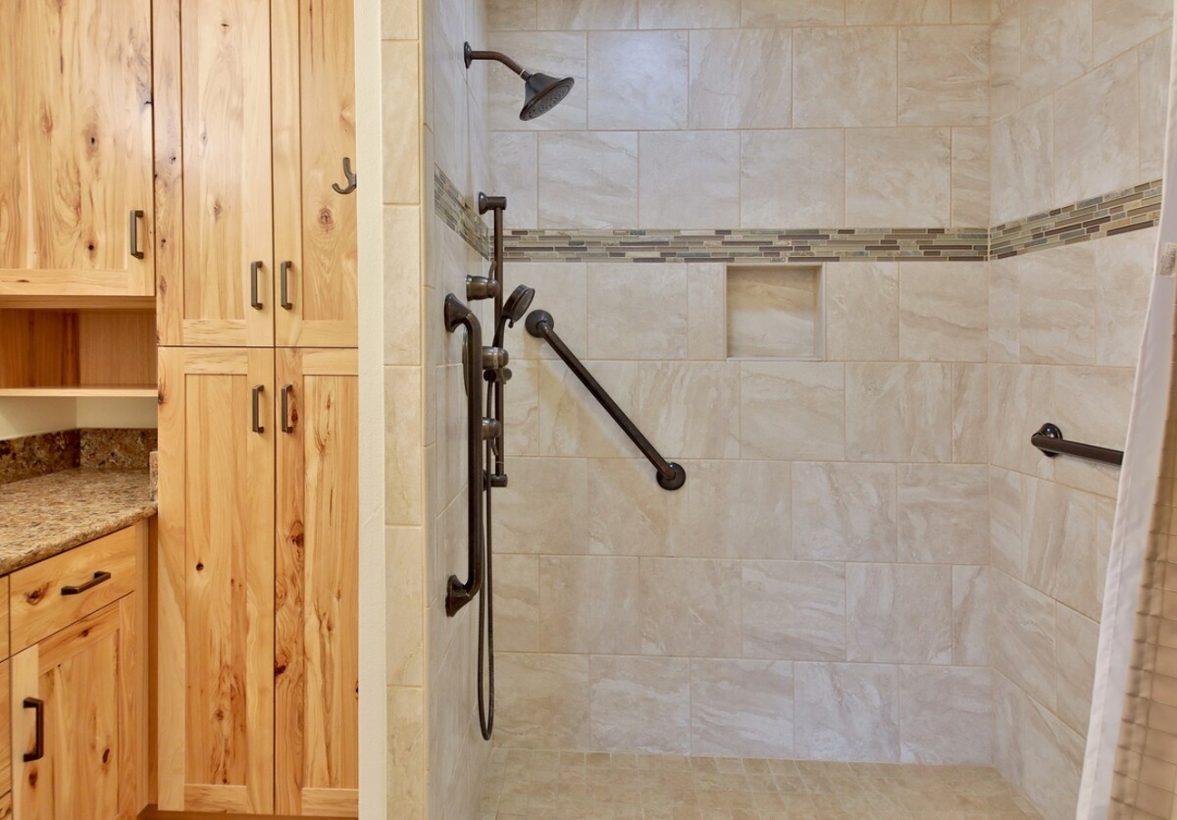 - Curb-less Walk-In Shower: Designed for easy access with an overhead shower and a six-foot handheld nozzle.