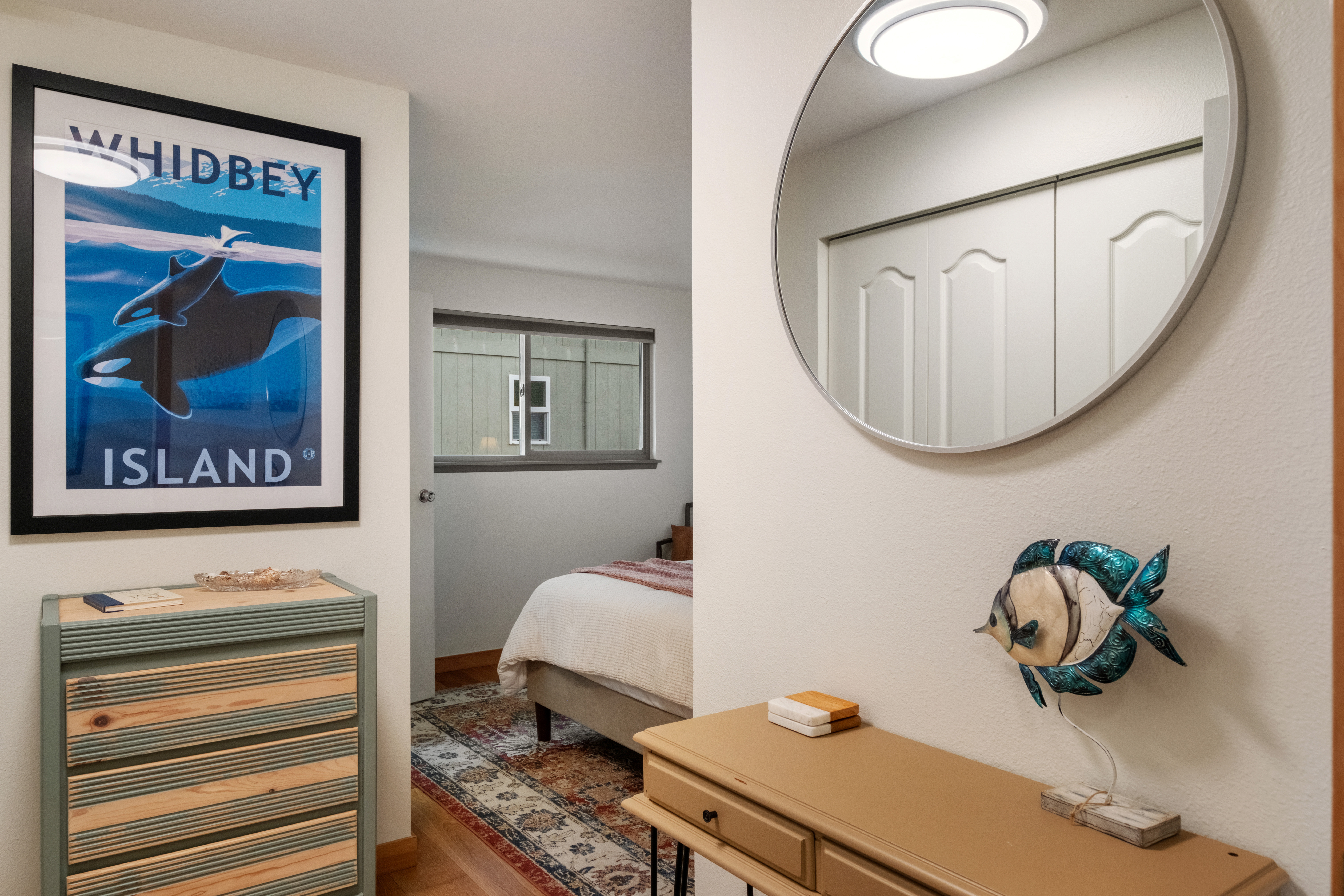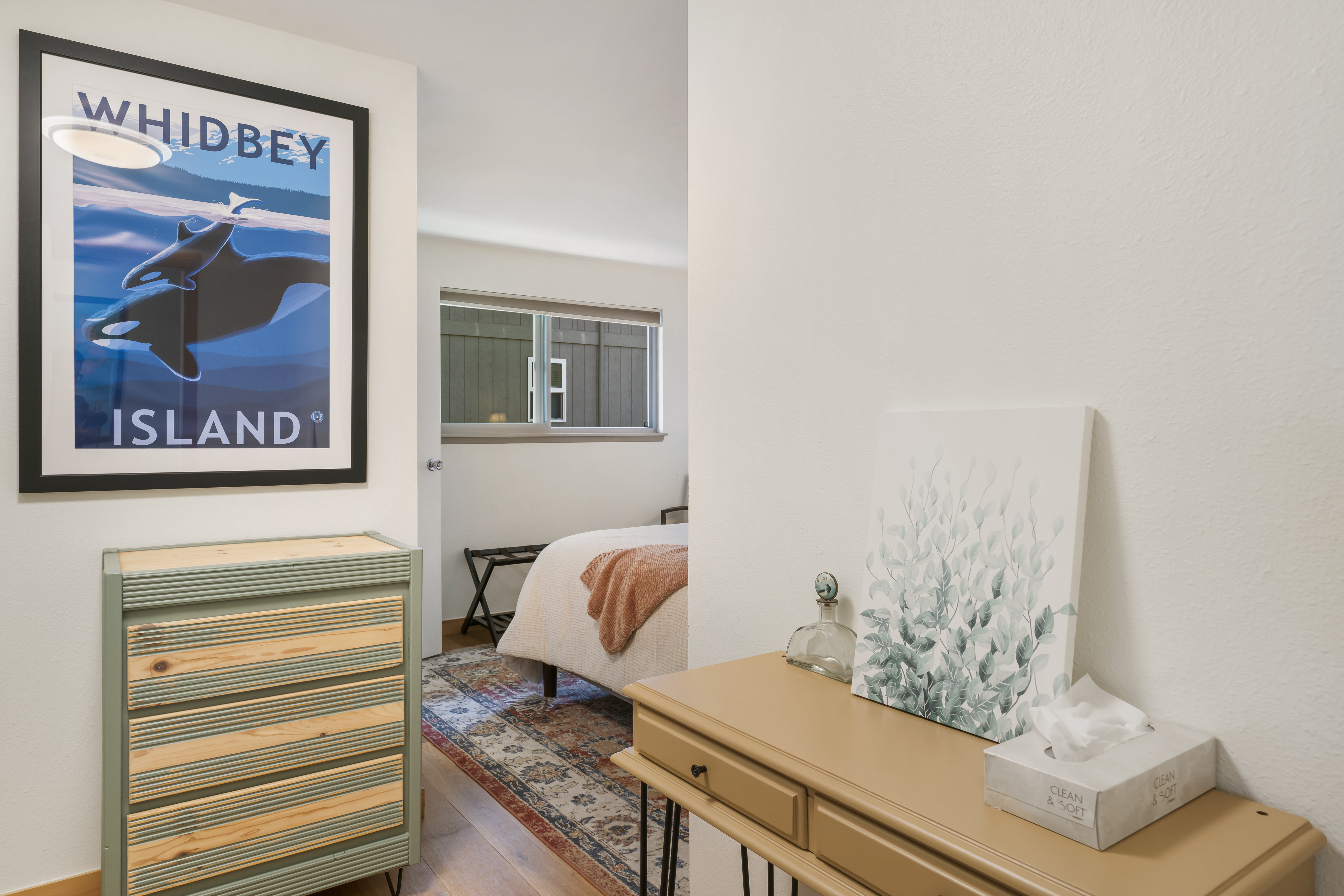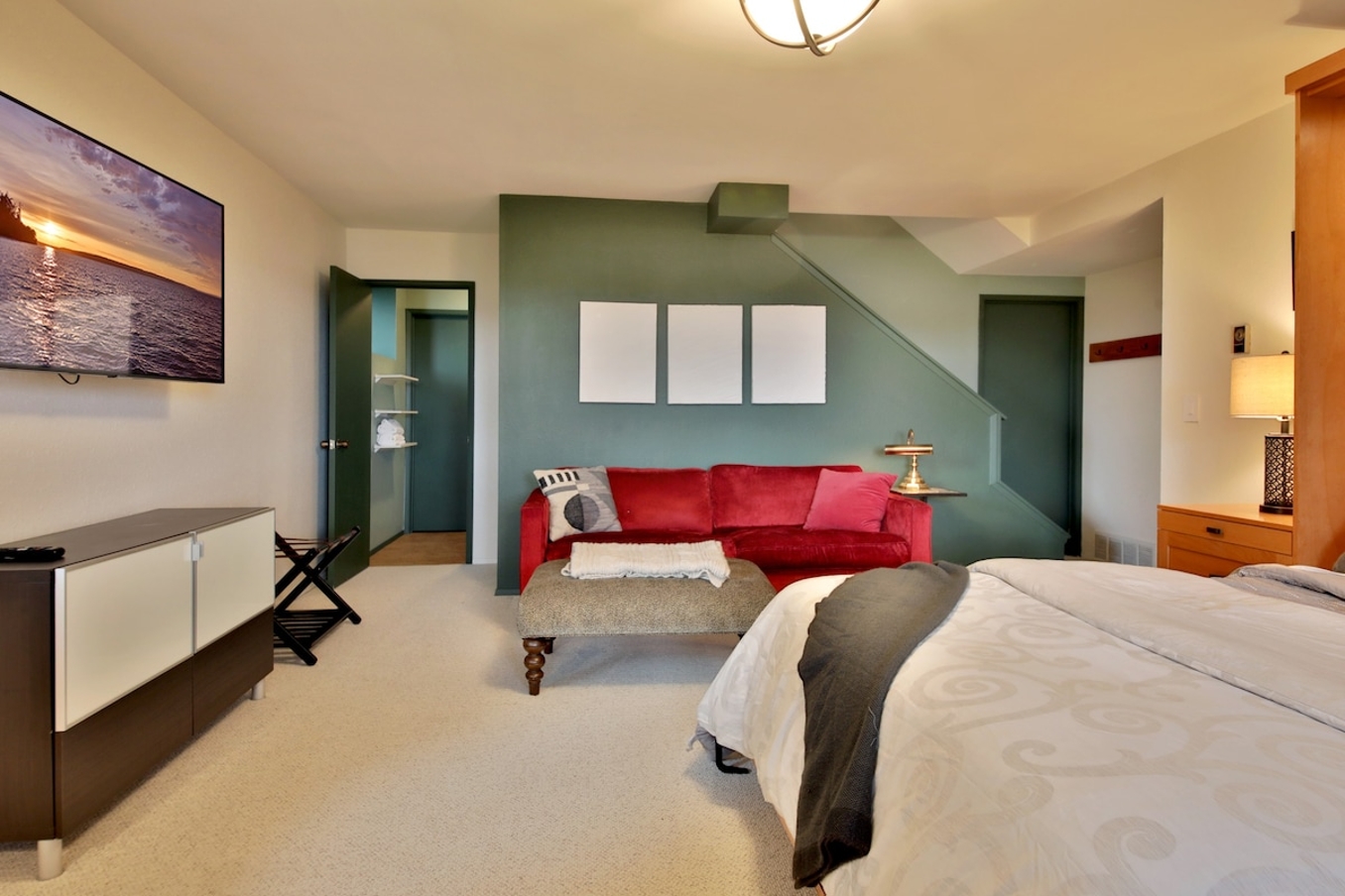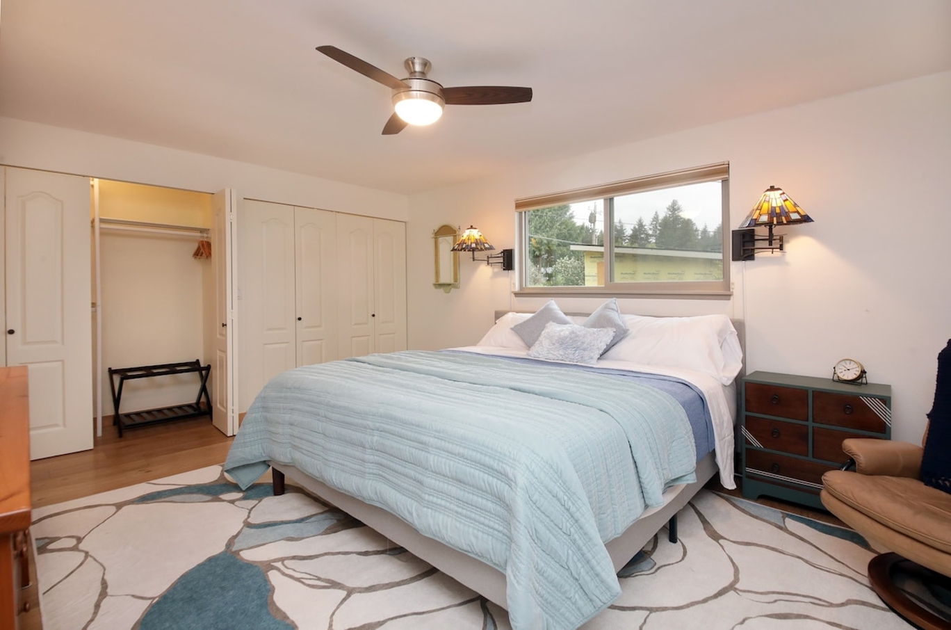 - Ample Storage: Features a large dresser, two spacious closets with a luggage rack, and plenty of hangers.