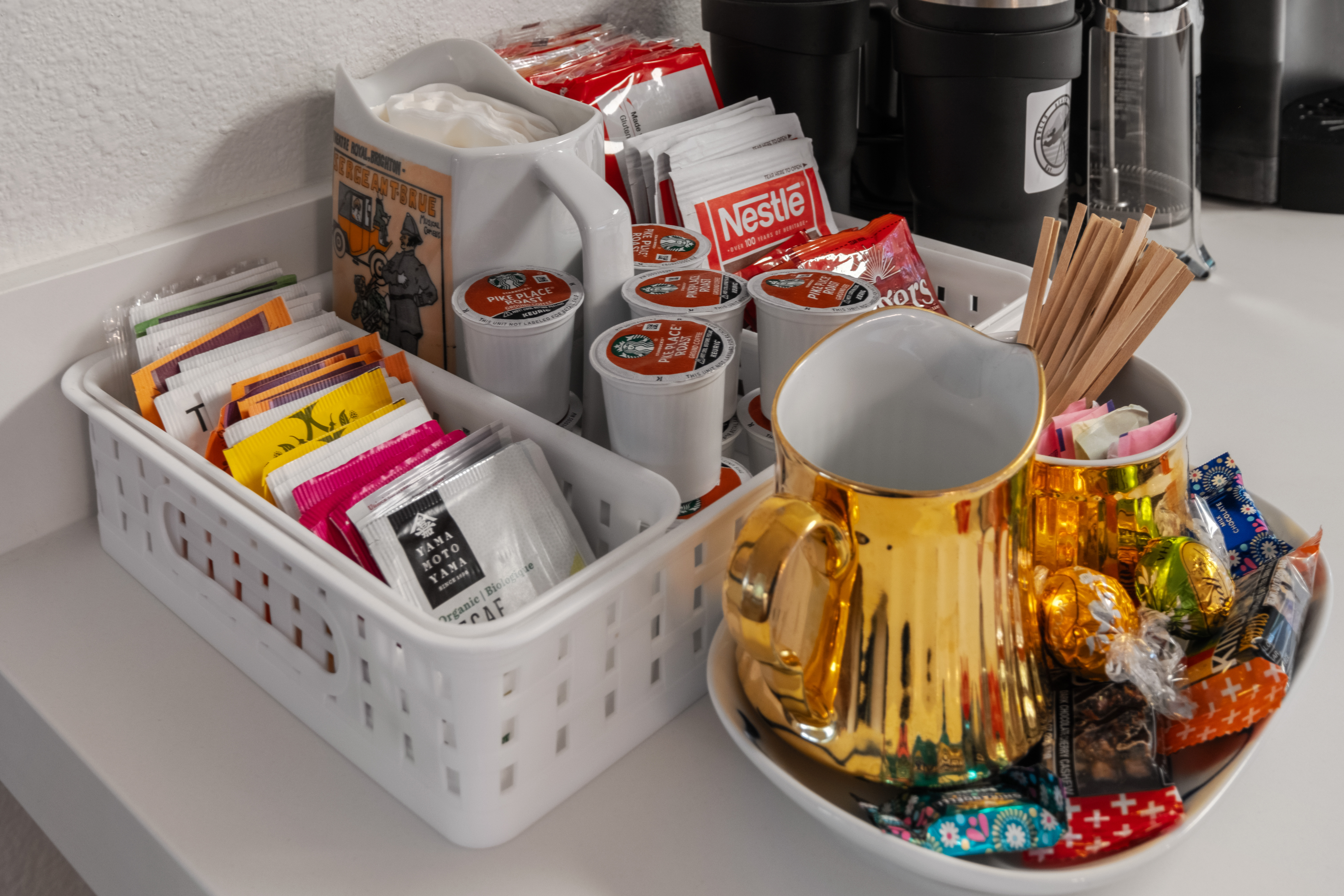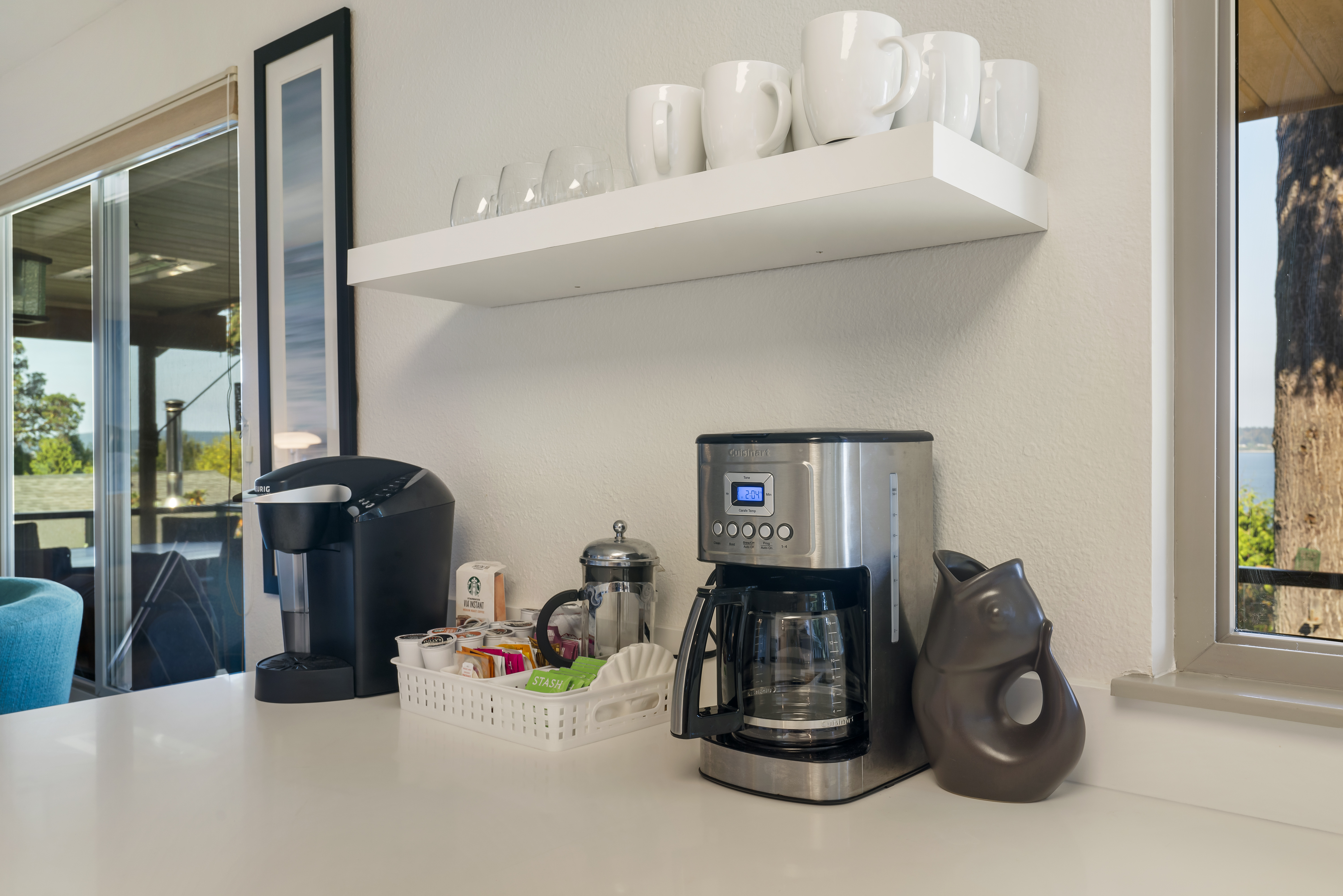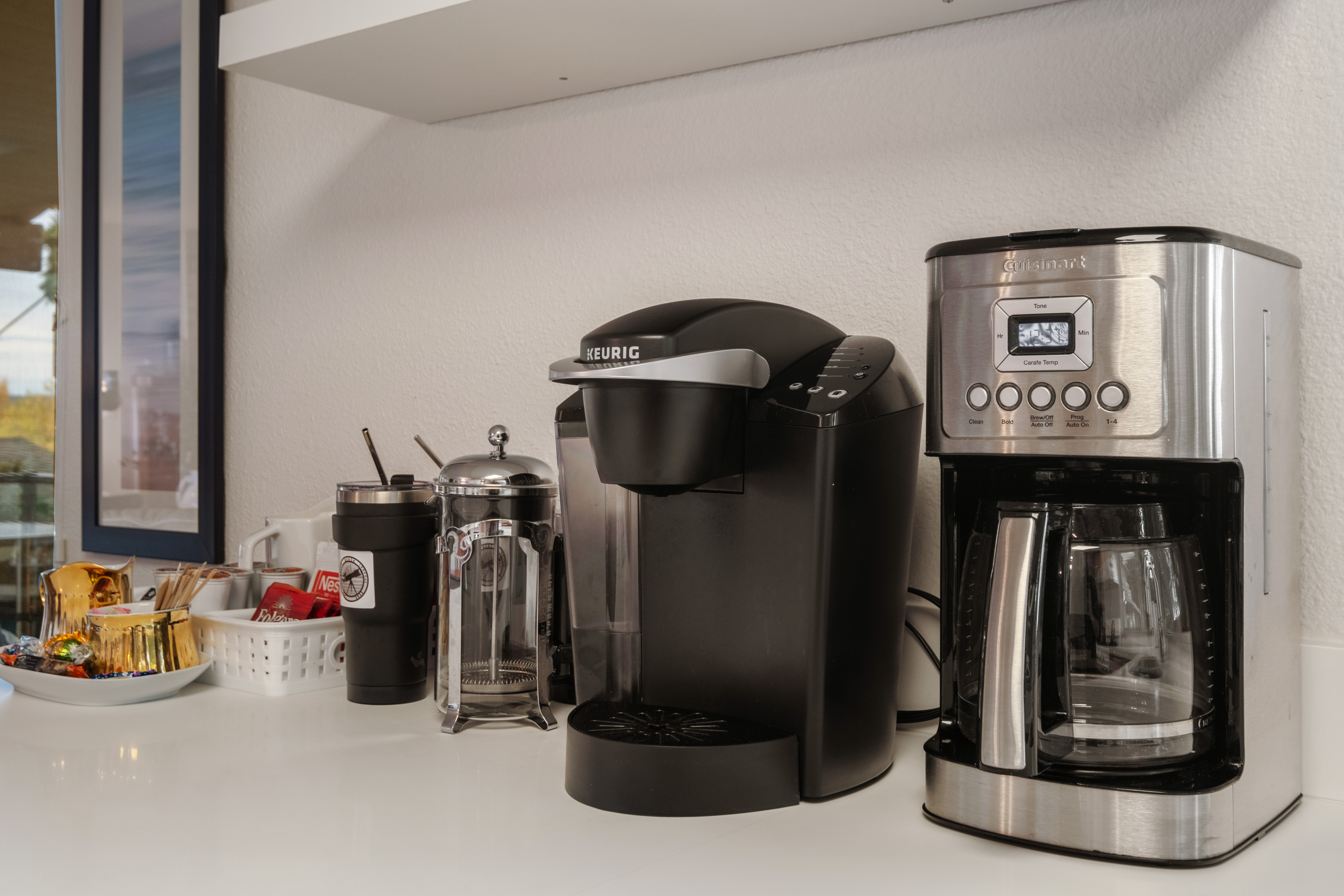 - Coffee Station: Features a Cuisinart coffee maker, Keurig machine, and French press, with complimentary Keurig pods and an assortment of teas.