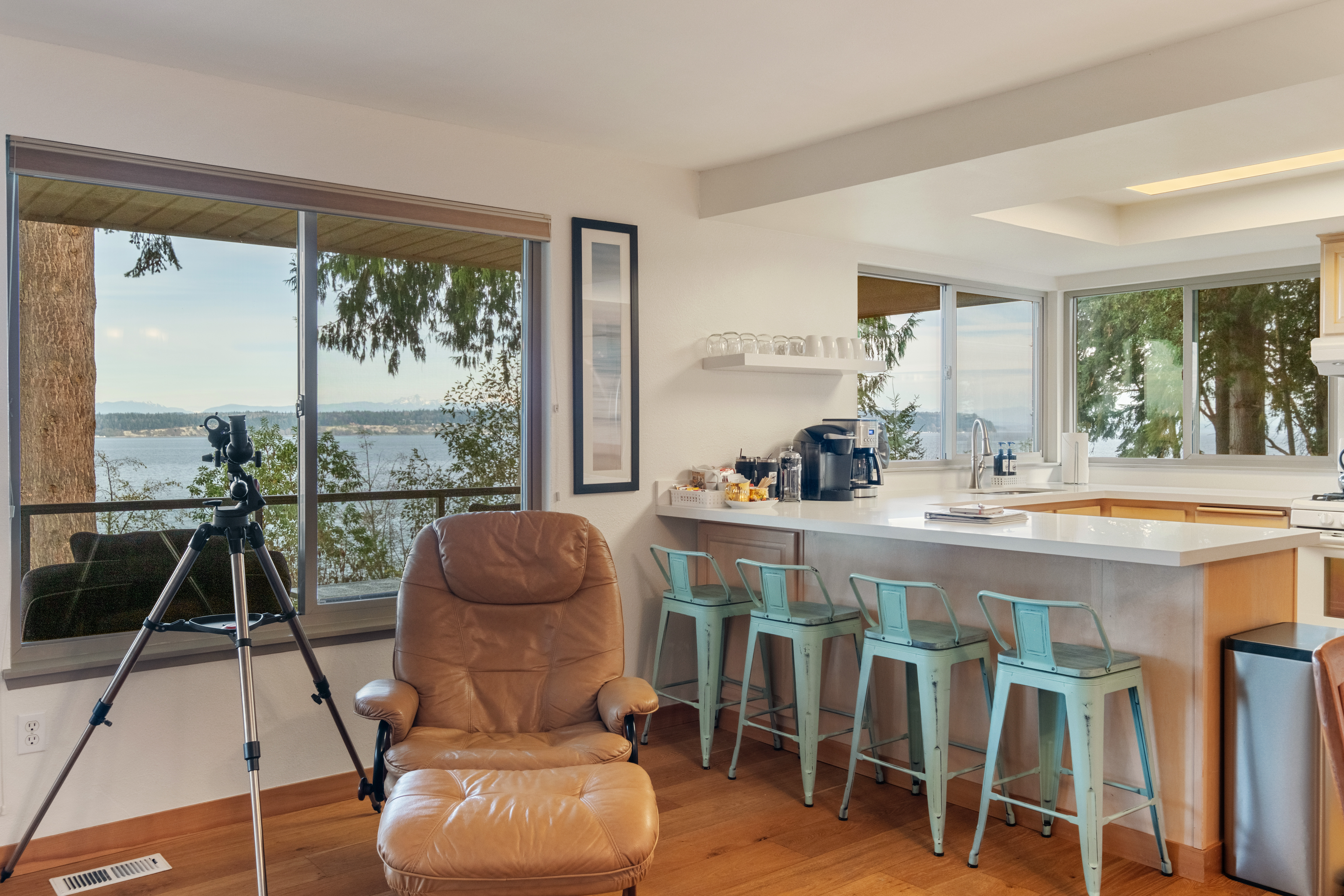 -Stunning Views: Surrounded by walls of windows offering breathtaking vistas of the water and mountains.